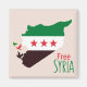 Um design com a bandeira da Revolução Síria dentro no mapa da Síria, com pombos de paz e a frase "Liberdade na Síria".