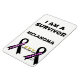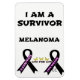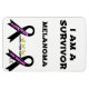 Um sobrevivente de Melanoma! No topo da design estão as palavras "Eu sou um sobrevivente" Sob estas palavras está a palavra "Melanoma" e "Live for Life". Na parte inferior da design estão 2 fitas pretas, que é a cor do cancer do melanoma. Numa fita, diz "Um sobrevivente" e na outra fita preta estão as palavras "viver para a vida". Entre essas duas fitas estão as palavras "Live for life" com 3 borboletas amarelas acima do centro dessas palavras. Na parte inferior da frente da design abaixo da fita preta direita estão as iniciais CC em homenagem à minha irmã sobrevivente do Cancer Melanoma!