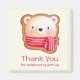 Um obrigado que você imã com um rosto de urso fofo e adorável colocado em uma base de biscoitos. Vestindo um cachecol listrado vermelho e branco.