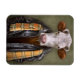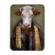 Esta design apresenta um retrato de uma vaca em uma jaqueta de couro e um cachecol.