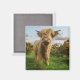 Uma jovem e amigável vaca escocesa Highland está se aproximando ao nascer do sol. Você pode até ver o olho dele que é tipicamente coberto por seu cabelo embaraçoso.
