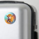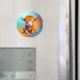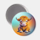 Um imã de vaca doce giro e adorável, com fundo azul e laranja.