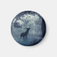 Magnet com foto de um veado real com galhadas em uma floresta sombria entre árvores iluminadas pelo sol. Neve caindo por toda parte.