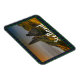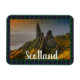 Fotografia cêntrica do Velho Homem da formação de rochas de Storr na Ilha de Skye com grande cobertura de texto "Escócia". O plano de fundo é o padrão de latras Clan Sutherland da Highland