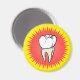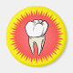 Decorra a geladeira com um ímã redondo louco com um Molar engraçado puxado recentemente em uma explosão vermelha. O fundo é amarelo.