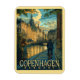 Descubra o charme de Copenhagen com este poster de viagens maravilhoso do estilo vintage. A ilustração mostra um homem andando sobre edifícios românticos sob um belo céu azul. Perfeito para um presente para os entusiastas da viagem.