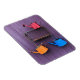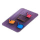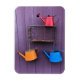 Latas de água, bonitas e coloridas, contra uma parede de madeira pintada roxa. Muito fofo e criativo decor de jardim!