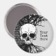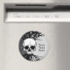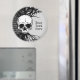Design de alto contraste preto e branco de um crânio com uma árvore crescendo no fundo preto.