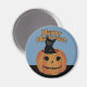 Uma imagem tirada das vintage cartas de Halloween de um gatinho preto sentado numa abóbora de Jack'o'lantern.