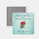 Um imã de casamento com a noiva e o nome do noivo e a data do seu casamento.Uma ilustração de uma rosa vermelha florescente aberta com o caule visível e cercado por uma folhagem verde. O fundo tem uma sensação vintage com um falso pergaminho numa cor verde-menta. Personalize com suas informações pessoais.