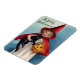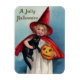 Uma imagem adorável e vintage de uma bruxa menina, segurando seu gato preto e uma abóbora, com desejos de "Um Dia das Bruxas de Jolly", aparece neste ímã. Faz um presente excelente para festas de Halloween, aniversários ou para decorar sua casa!