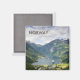 Fotografia do famoso fiorde Geirangerfjord, navio de cruzeiro e aldeia de Geiranger entre as montanhas da Noruega, com o texto: "NORUEGA, Geirangerfjord".