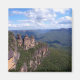 Três Irmãs, Montanhas Azuis, NSW, Austrália. Totalmente personalizável. As Três Irmãs é uma formação rochosa nas Montanhas Azuis de Nova Gales do Sul, Austrália. Estão perto da cidade de Katoomba e são um dos sítios mais conhecidos das Montanhas Azuis, que se alastram acima do Vale de Jamison. Os seus nomes são Mehni (922 m), Wimlah (918 m) e Gunnedoo (906 m). As Irmãs foram formadas pela erosão. O arenito macio das Montanhas Azuis é facilmente corroído ao longo do tempo pelo vento, chuva e rios, e os penhascos em torno do Vale do Jamison estão sendo lentamente quebrados. Formações como as Três Irmãs são criadas quando a água penetra em pequenas fissuras na rocha, aumentando-as gradualmente ao longo do tempo para formar grandes indentações. Eventualmente, as Irmãs serão completamente destruídas.