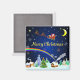 Bonitas paisagens de neve com árvores de Natal, casas, um homem de neve, e um arco-íris sobre a neve caindo do céu. Papai Noel sobrevoando a lua crescente na noite de Natal.