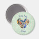 Um magnata com uma expressão doce. O texto diz que você é amado. Com um design de penas de aquarelas em forma de coração. Definido em um fundo verde de menta estilo vintage com bolinhas rosa e brancas desbotadas.