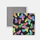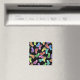 Ilustração de muitas pegadas coloridas com rostos sorridentes felizes pisando em um fundo preto. Imagem disponível em vários presentes e produtos.
