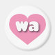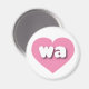 Este ímã apresenta um coração cor-de-rosa contendo as letras maiúsculas, brancas, arredondadas e maiúsculas, uma abreviação lúdica para Washington, o estado evergreen.