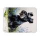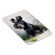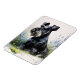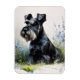 A soft watercolor-style illustration of a calm schnauzer seated among delicate blue wildflowers and meadow grasses, featuring gentle textures, a light neutral background, and a peaceful, natural atmosphere.