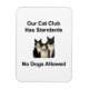 Imagem de 3 polegadas x 4 polegadas com a imagem "Nosso clube de gatos tem padrões - não são permitidos cachorros" que é divertida e humorística. É um design relâmpago — perfeito para amantes de gatos que apreciam um pouco sarcástico, humor de "regras de gatos, cães babam".