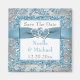 Esta cinza azul-gelo, prata e cor damasco floral brilhante FAUX branca salve a data em que o íman de casamento tem uma fita azul IMPRESSA e arco com um par de brilhante FAUX IMPRESSO e joias de diamante uniram-se a ele que combina com os convites de casamento mostrados abaixo. O texto é personalizável para que você possa alterá-lo para dizer "Obrigado" e dar como um favor de casamento, se quiser. Se você precisar de outros itens correspondentes neste design, envie seu pedido por e-mail para niteowlstudio@gmail.com.