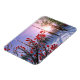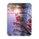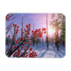 Morangos vermelhos brilhantes cobertos de gelo espumante contra o pano de fundo de um pôr do sol brilhante de inverno atrás de árvores negras e pinheiros escuros.
