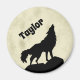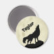 Mostre seu lado selvagem com esta imã de geladeira personalizada. Ele apresenta uma ilustração ao estilo da silhueta de um lobo em preto uivando em um fazer de lua amarela pálida que é perfeito para quem ama animais. Este ímã está pronto para ser personalizado com um nome ou outro texto. Torna um excelente pequeno presente ou um favor de festa personalizado.