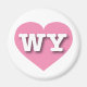 Este ímã apresenta um coração legal, cor-de-rosa contendo as letras negrito, branca, maiúsculas WY, a abreviação oficial de Wyoming, o estado de igualdade.