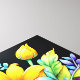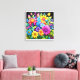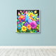 The composition is filled with various flowers and foliage rendered in vivid, almost luminous colors, including hot pink, brilliant yellow, electric blue, and deep purple. The style is highly decorative and digital, with a glossy finish that makes the colors pop dramatically. The focus is on the intense contrast between the vibrant, fantastical flora and the deep black void, giving the arrangement an energetic and bold aesthetic.