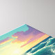 This image is a dynamic, highly saturated illustration capturing a massive, cresting ocean wave at sunset, rendered in a striking, expressionistic style. The wave is a blend of deep blue and vivid turquoise-green, with the spray on the left side depicted as brilliant, fiery orange and yellow. The background features a dramatic sky with clouds highlighted in pinks and lavenders, adding a mythological quality to the tumultuous scene.