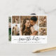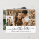 Cartões salve a data de Colagem de Fotos do Script 5 de Caligrafia Minimalista Moderna Elegante de Orçamento em preto e branco. Este romântico e delicado design perfeito para o casamento moderno. Possui 5 (cinco) colagem de fotos em grade, uma caligrafia química com letra de coroa do estilo swash à mão. É fácil personalizá-lo com seus detalhes e fotos do casamento. Cartões de barato baratos de baixo orçamento.