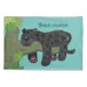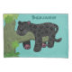 Esta onça negra feliz está dormindo em uma árvore. Desenhado no estilo de ilustração de desenho animado em um fundo teal.