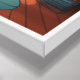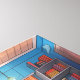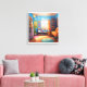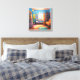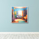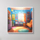 A imagem retrata um quarto acolhedor e colorido com uma parede azul vibrante adornada com nuvens e uma janela sobre uma paisagem urbana. A sala apresenta uma cama confortável com um edredão laranja, uma estante de livraria repleta de livros, e uma coleção de plantas cercadas acrescentando um toque da natureza. A impressão geral é de um espaço alegre e convidativo, refletindo a personalidade de seu habitante.