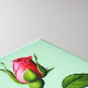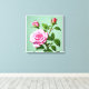 A imagem retrata um trio de rosas cor-de-rosa, cada uma em diferentes palcos de floração, contra um pano de fundo verde macio. O rosa central está no florescimento do cheio, com suas pétalas se desenrolando graciosamente para revelar um delicado centro em forma de coração. Dois botões menores flanqueam o rosa central, acrescentando um sentido de dinamismo à composição. Os rosas são processados com detalhes refinados, capturando as sutis variações de cor e textura das pétalas. As folhas e caules verdes esmagados fornecem um contraste vibrante com a cor-de-rosa macia dos rosas, enquanto o fundo verde-mudo permite que as flores tomem palco central.