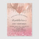 Um fundo rosa dourado e cinza rosa-claro. Decorado com rosa dourado, brilho rosado, aspecto de pingar tinta e balões. Personalize e adicione um nome e detalhes da parte. O nome é escrito com um script de estilo manuscrito