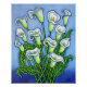 Impressão de pintura colorida estilizada de lindos lírios brancos Calla, feita em uma bela paleta azul, verde e branca por Lisa Lorenz