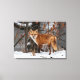 Uma raposa pára para olhar em chão de neve na borda da madeira.