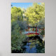 A ponte vermelha pacífica sobre uma lagoa em um antigo local de mineração de fosfato que o proprietário converteu para piscinas de reflexão silenciosas em um jardim Zen.