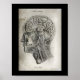 Ilustração vítrea da seção transversal do crânio humano mostrando o cérebro, a coluna cervical, os nervos espinhais e as artérias.