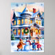Uma casa vitoriana coberta de neve com luzes quentes brilhando dentro, uma coroa na porta, e crianças brincando lá fora.