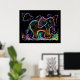 Um elefante giro esboçado em cores do arco-íris num fundo preto.