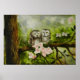 Óleo pintando Corujas de Bebê. Impressão para venda. Flores cor-de-rosa cortam na árvore.