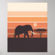 Crie um berçário sereno e elegante com esta impressão de parede boho safari apresentando uma silhueta minimalista de elefante africano e árvore acácia contra blocos de cores terrosas quentes. Ideal para temas modernos de berçário de selva, este design combina tons desérticos calmantes com imagens de animais atemporais.