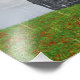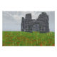 Uma cena 3D criou em Vue, mostrando o local de uma batalha antiga, com apenas as ruínas desmoronantes de uma torre de pedra medieval e flores vermelhas na grama para comemorar. A chuva em queda e o efeito de aquarela macia aumentam a tristeza da cena do topo da colina.