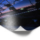 Iate na marina capturado durante uma hora azul com o pôr do sol colorindo o horizonte e o reflexo de um barco e marina visíveis na impressão do lado do iate.
