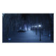 Um caminho coberto de neve que percorre a floresta de pássaros em uma noite escura de inverno. O caminho é alinhado com postes que exibem um brilho azul prateado, mas nas sombras estão formas brilhantes e mesmerizantes como pequenas luzes de fada, atraindo o viajante para fora da trilha. À distância, o brilho lavanda de uma misteriosa floresta se juntando ilumina o céu frio.