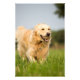 Impressão de foto de alta qualidade do Ouro Retriever correndo no gramado com uma bola na boca.
