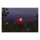 Ao anoitecer, os vagalumes flutuam e brilham sobre um jardim de rosa cheio de rosas vermelhas vibrantes.