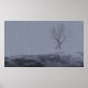 Uma paisagem 3D fria e ventosa no inverno, criada em Vue. Em cima de uma colina branca com gelo e neve, contra um céu de cinza tempestuoso com chuva ou manga caindo firmemente, uma árvore de bordo solitária e nua se posiciona com um banco de madeira embaixo dela.