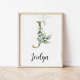 Adicione um toque de charme natural ao quarto do seu bebê com esta impressão de nome de berçário verde. Com delicada folhagem e texto de nome personalizável, é o enfeite personalizado perfeito para um berçário sereno e elegante.