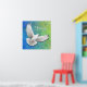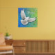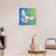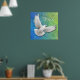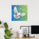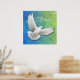 Design de arte original de uma elegante pomba branca de paz contra um bonito fundo verde azul da artista Carolyn McFann do Two Purring Cats Studio impresso em um impressão de qualidade.